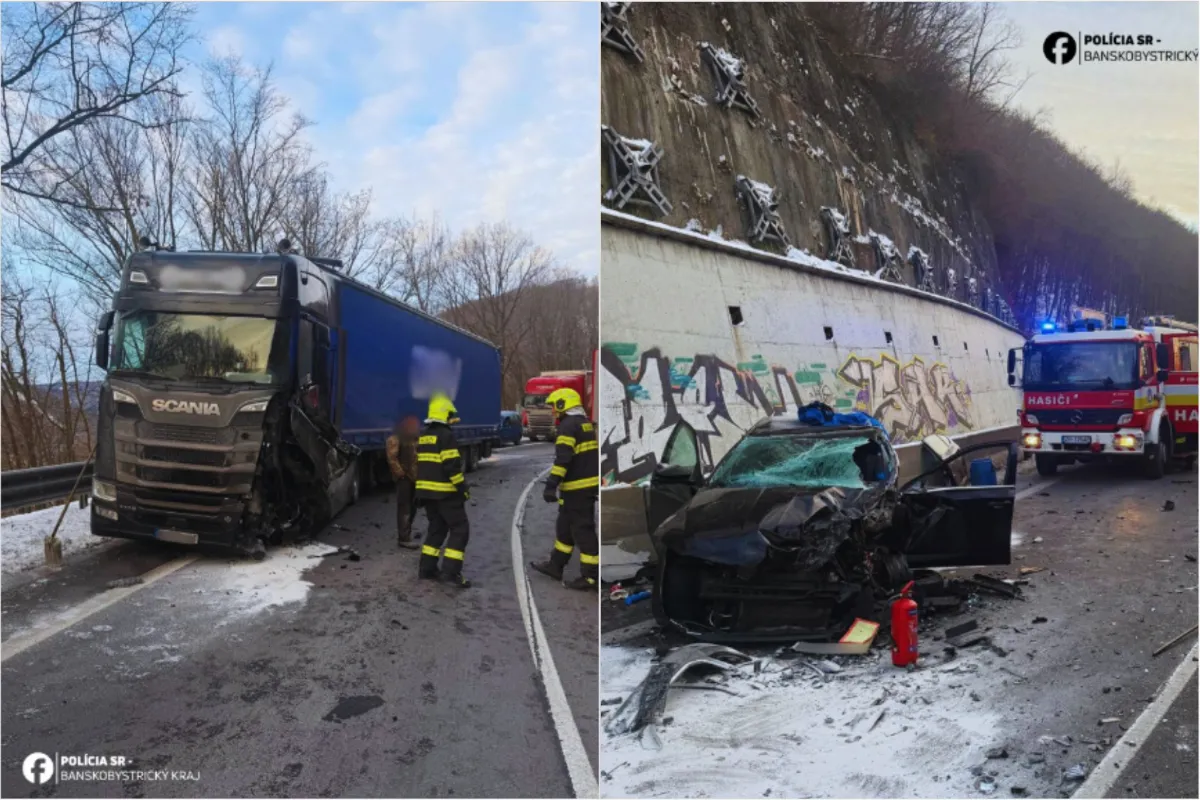 Pozor, úsek v smere na Žiar nad Hronom je neprejazdný, zrazilo sa tam auto s kamiónom, vodička skončila v nemocnici